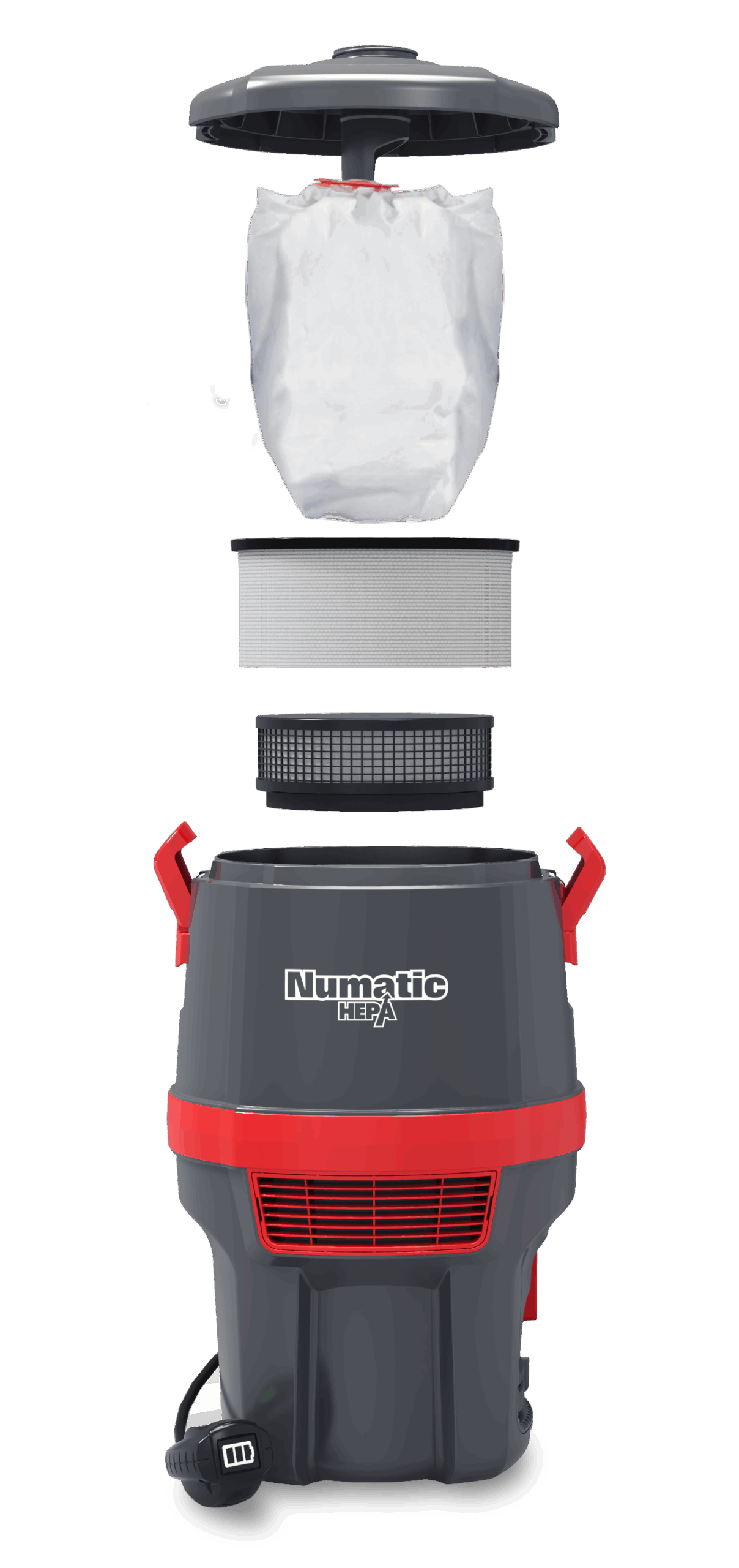 - HEPA13 Filter Cartridge Certified HEPA13 filtration down to 0.3 microns at 99.97% efficiency. Our most advanced filtration in the Numatic commercial vacuum series.