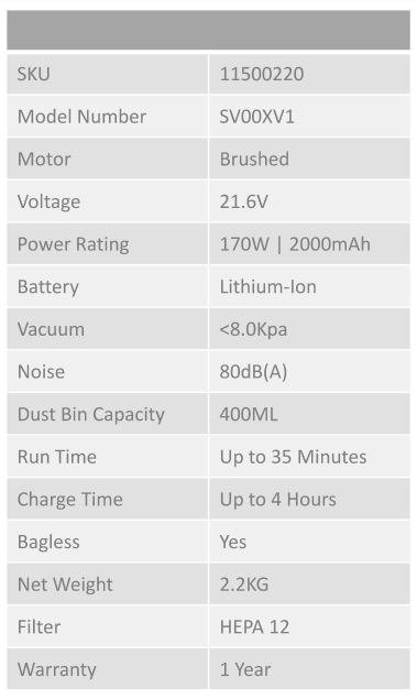 The Henry Quick stick vacuums have a battery with a voltage of 25.2 V. The battery life is comparable to other stick vacuums: 60 minutes. It is a detachable battery that you can easily replace for a new one if necessary. The vacuum cleaner itself weighs 3,175 kilograms (7 lbs).